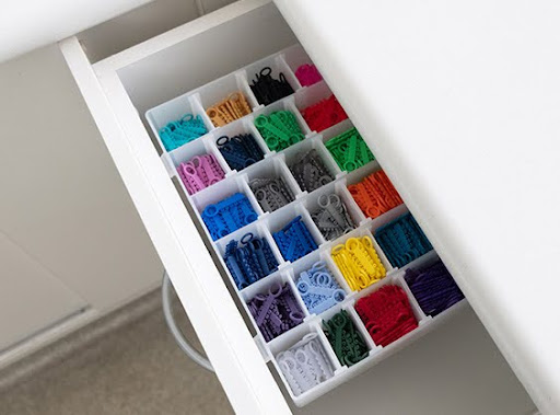 Coloured modules are small rubber-like elastics that secure the archwire to the brackets attached to your teeth. While their main function is mechanical – maintaining orthodontic pressure – they are available in dozens of colours, from neutral to vibrant.